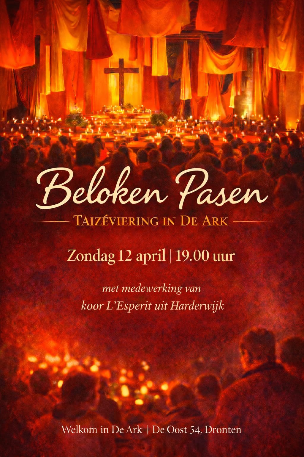 Wanneer de avond valt en het licht zachter wordt, zoeken we verstilling. Met meditatieve liederen uit Taizé, gedragen door koor L’Esprit uit Harderwijk en door ons allen, met momenten van stilte, gebed en schriftlezing, nemen we de tijd om Pasen dieper tot ons door te laten dringen.