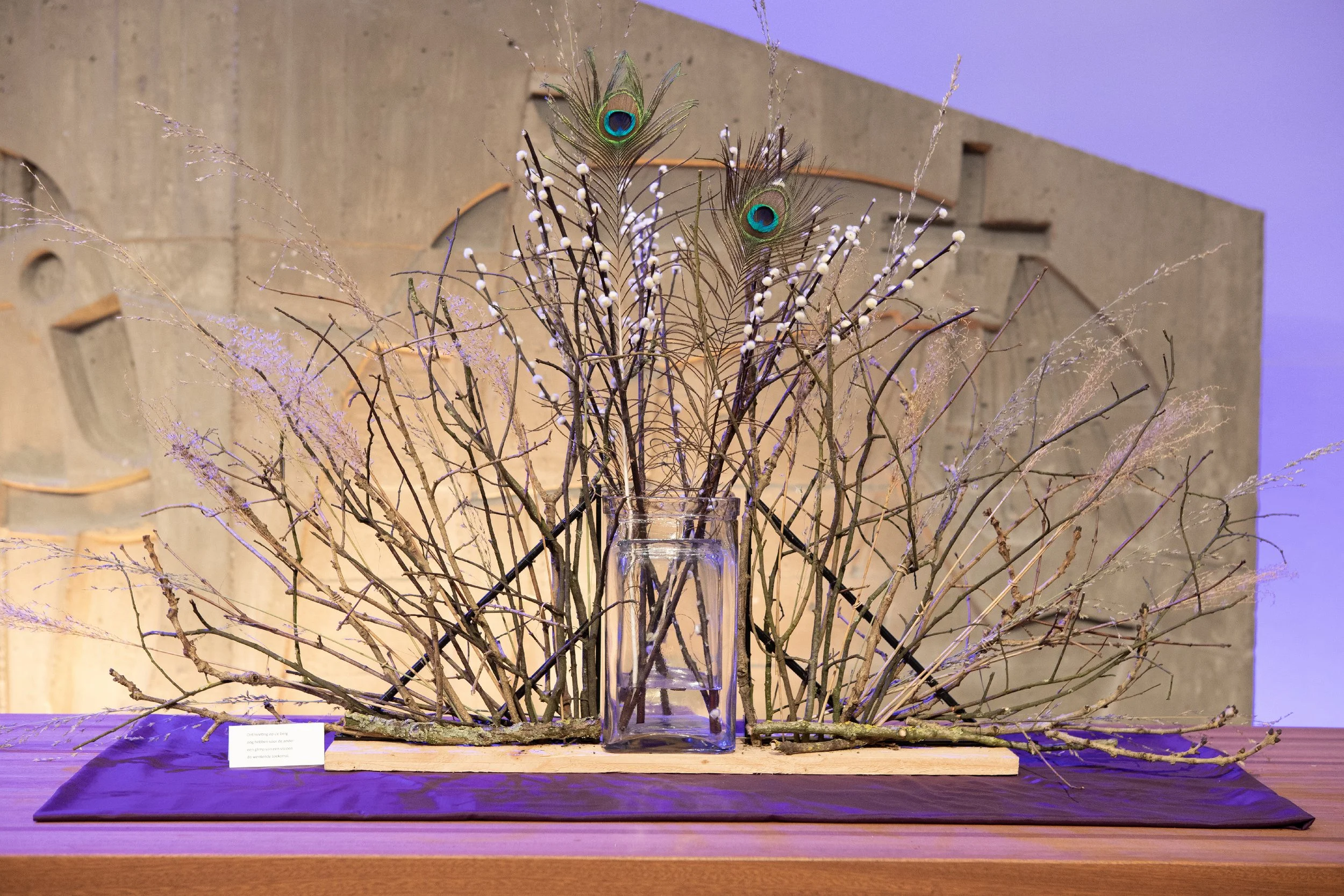 De waaier met takken en grassen laten zien dat de Geest ons wegen van hoop wijst. De twee pauwenveren in de vaas verbeelden deze ontmoeting waarbij zij oog hebben voor elkaar. De wilgenkatjes zijn het teken van groeien en vertrouwen.