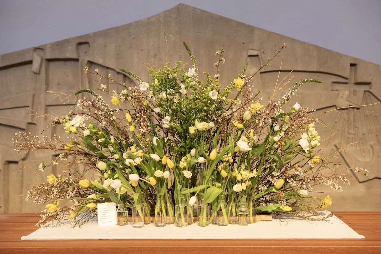 Het feest van Pasen is zichtbaar gemaakt in de waaier met groene takken en veel witte en gele bloemen.